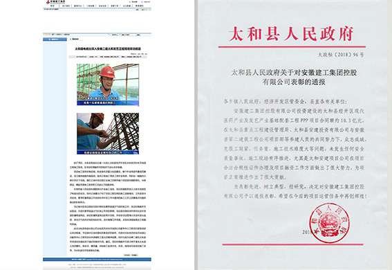 經過兩年的“浴血奮戰”,2018年9月30日,太和PPP項目完成交工驗收工作,項目建設圓滿收官,并受到太和縣人民政府及太和縣重點示范工程領導小組辦公室的一致表彰,為公司品牌宣傳,形象提升做出積極努力,為“打造一流安徽建工”添磚加瓦。