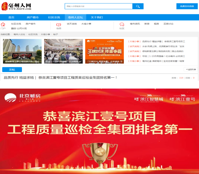 第四分公司亳州濱江壹號項目喜獲北京城房集團工程質量巡檢第一名